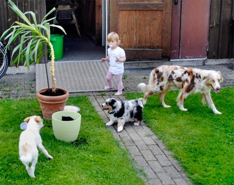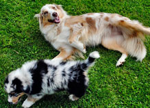 Unsere beiden Australian Shepherds “Pearl” und “Blue” sind herzensgute, treue Hunde. Während Blue lieber mit Kindern spielt und der ideale Familienhund ist, so ist Pearl eher die aktiv sportliche Hündin und wird auch täglich gefordert.