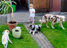 Beide sind sehr kinderlieb und legen großen Wert darauf, ein wichtiger Bestandteil der Familie zu sein, was sie bei uns natürlich sind. Pearl´s Arbeitsweise macht ihrer Rasse alle Ehre. Australian Shepherds sind bekannt anspruchsvolle Aktivitäten mit Disziplin und einer meisterlichten Routine auszuüben.